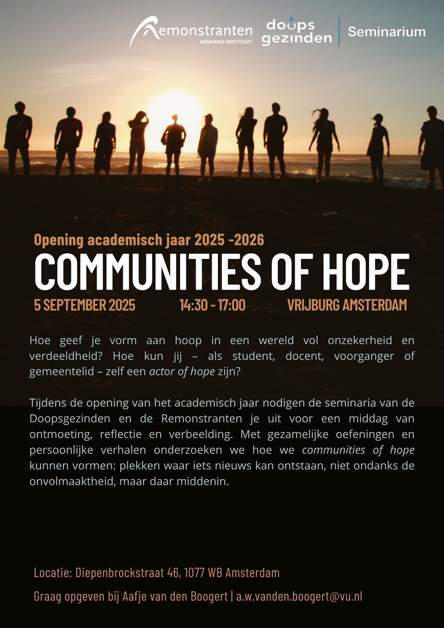 Ter gelegenheid van de opening van het academisch jaar nodigen het Doopsgezind Seminarium en het Remonstrants Seminarium studenten, curatoren, docenten en andere geïnteresseerden uit voor een middag van ontmoeting, reflectie en verbeelding.